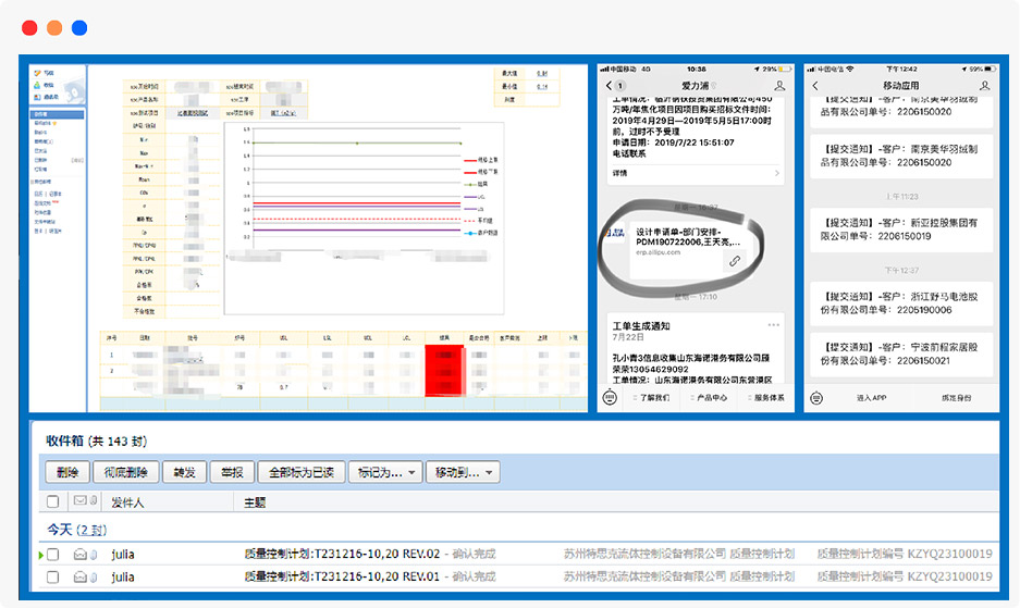 多通道实时触达(弹窗、短信、邮件),确保关键信息不遗漏:图纸变更时,自动通知工艺、生产、采购负责人;物料短缺时,触发采购加急提醒与库存预警。