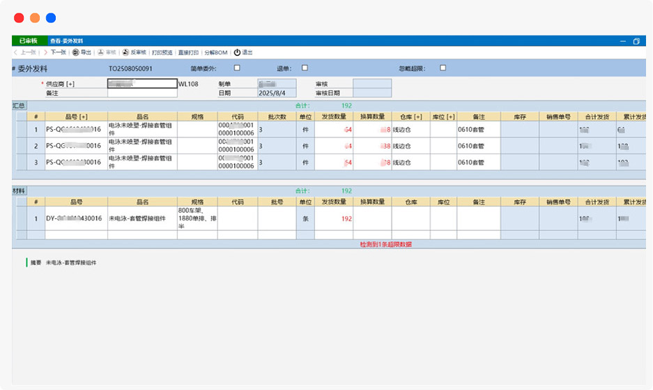自定义多节点审批流程(如图纸变更审批、超计划采购审核),支持条件分支(如金额 > 50 万自动触发董事长审批)、流程追溯与超时预警,缩短审批周期 30% 以上。